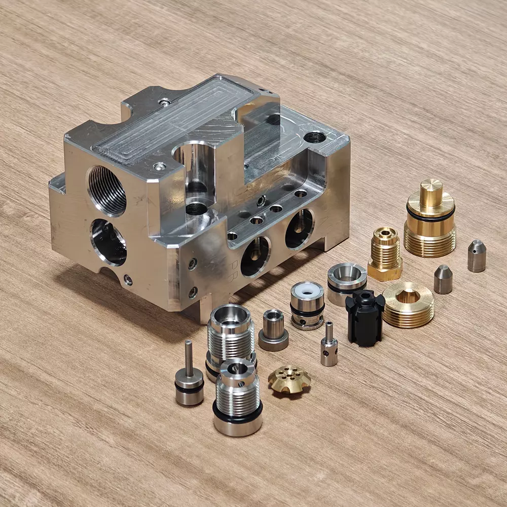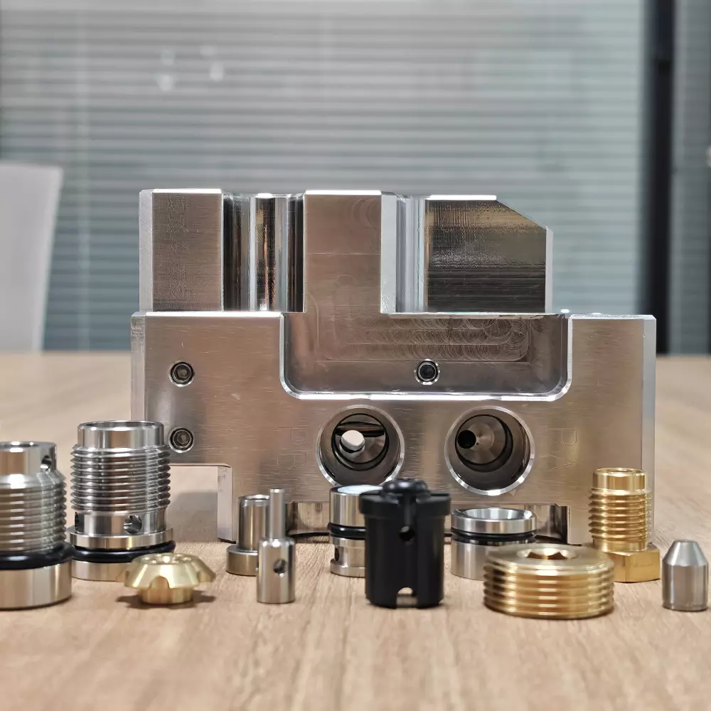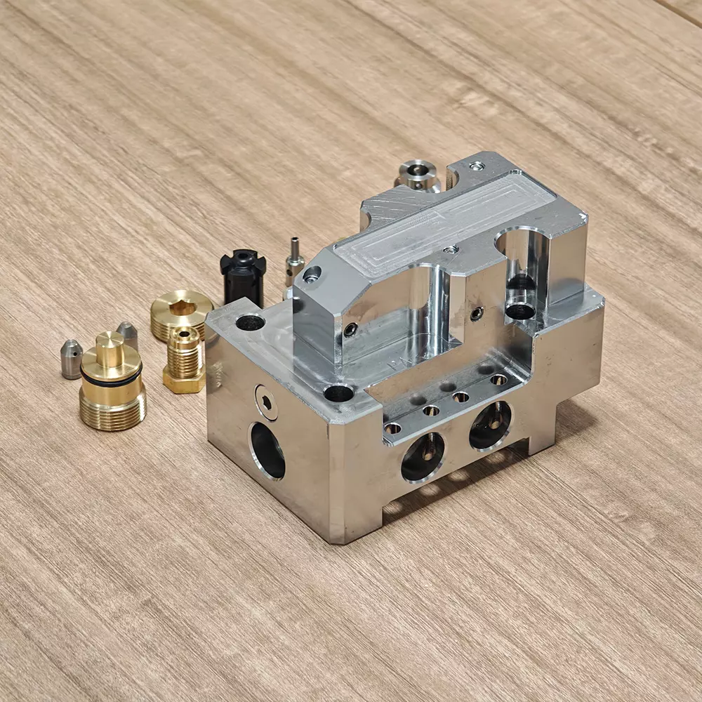 -Próiseáil groove: Úsáid cúig-lárionad meaisínithe ais chun druileáil agus muilleoireachtna bealaí sreafa casta taobh istigh den chomhlacht comhla a chríochnú, a rialú go docht ar an suíomh agus earráid coaxiality dena poill a ≤ 0.01mm, rud a laghdóidh caillteanas friotaíochta sreabhadh sreabhach.